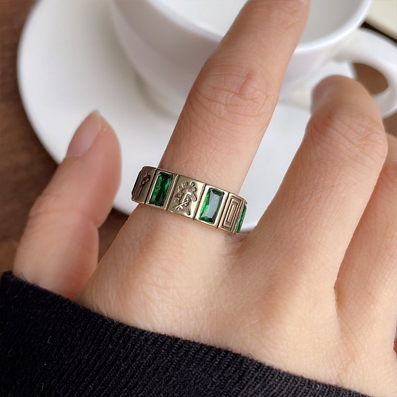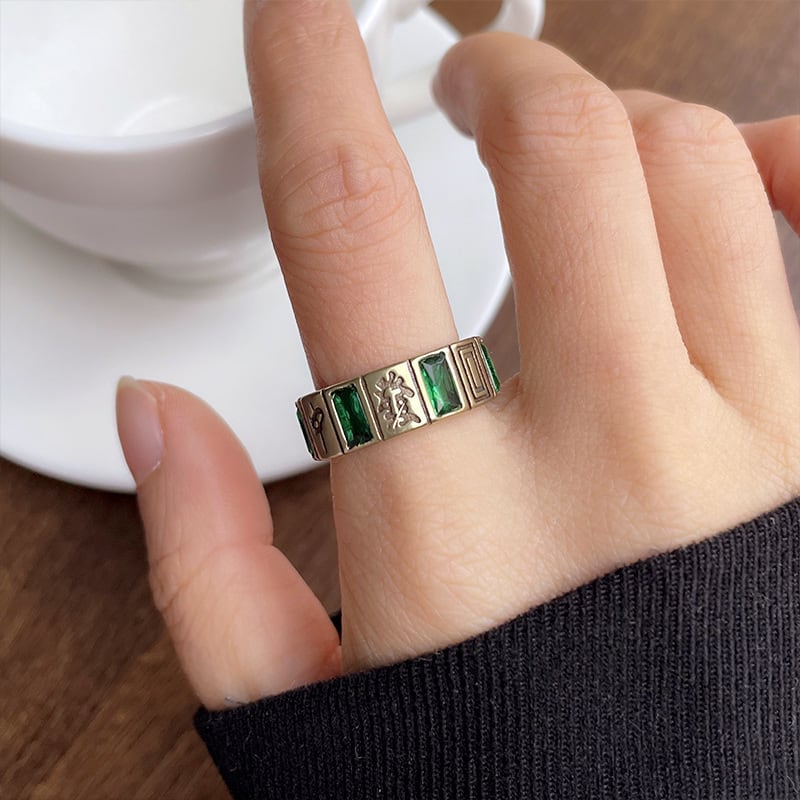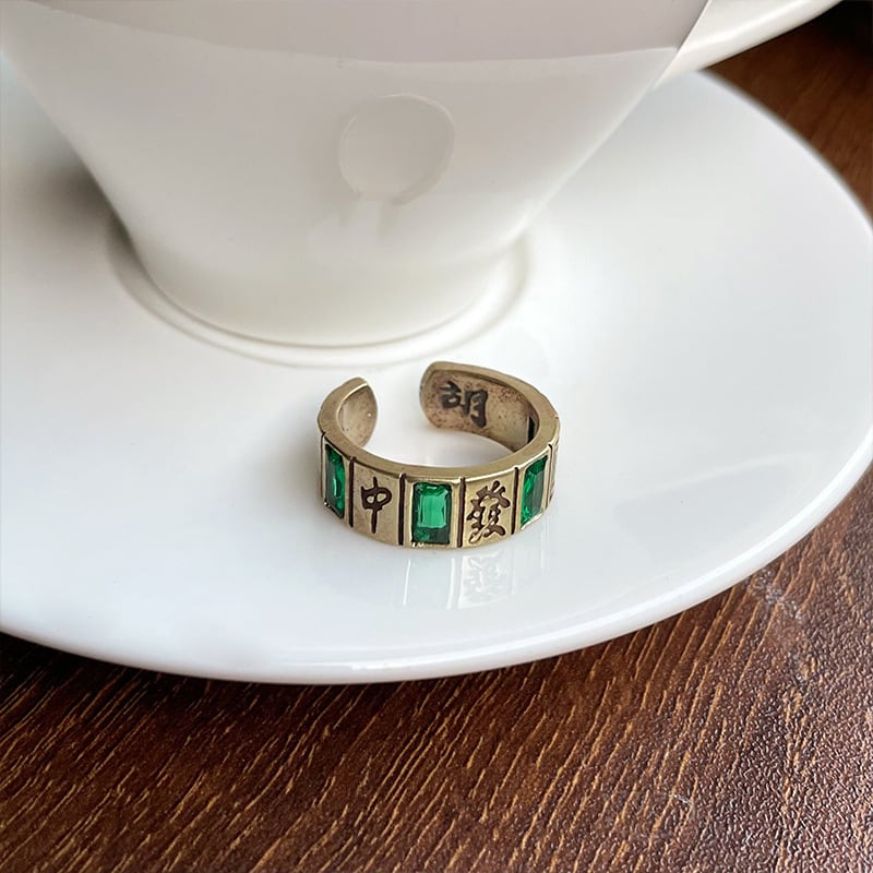麻雀牌とグリーンのストーンが並んだ存在感抜群の指輪。